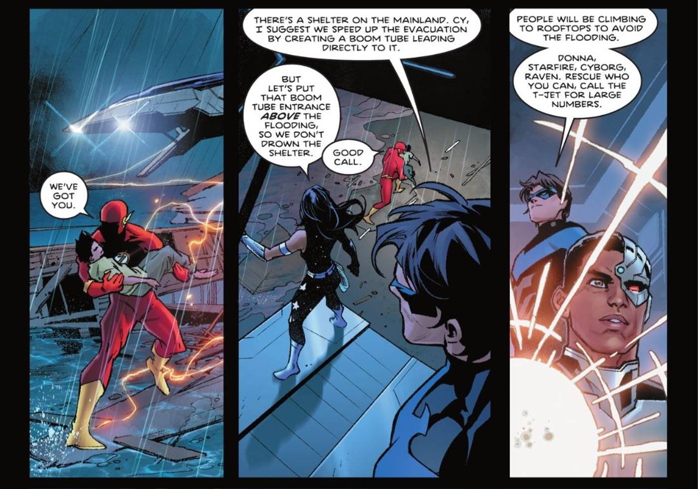 Cyborg presenta al equipo los últimos T-Jet y llegan a Key West casi al instante gracias a la tecnología Boom Tube de Cyborg. Colocaron el T-Jet cerca de un grupo de casas inundadas y comenzaron a encontrar residentes y a llevarlos a la seguridad del vehículo del equipo.
