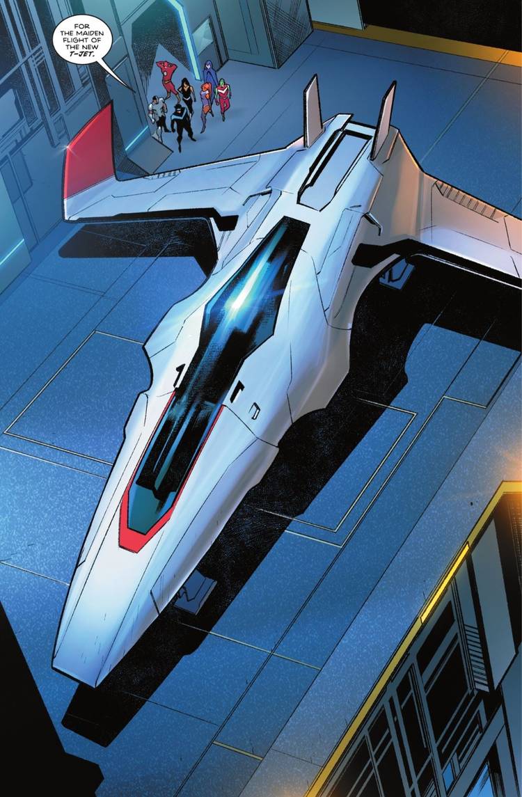 El T-Jet es un avión que los Titanes han utilizado periódicamente desde sus primeros días como héroes. Sin embargo, esta es la primera vez que sacan su vehículo clásico desde que entraron para ocupar el lugar de la Liga de la Justicia. Los Titanes no necesariamente necesitan el avión, ya que Cyborg puede llevarlos hacia y desde lugares con su tecnología Boom Tube. Pero Nightwing y sus amigos han sido firmes en que no están aquí sólo para luchar contra los villanos, sino que están aquí para proteger a la humanidad. El T-Jet está bien equipado para Lleva a los Titanes a cualquier lugar en poco tiempo y ayúdalos a rescatar a la mayor cantidad de personas posible..