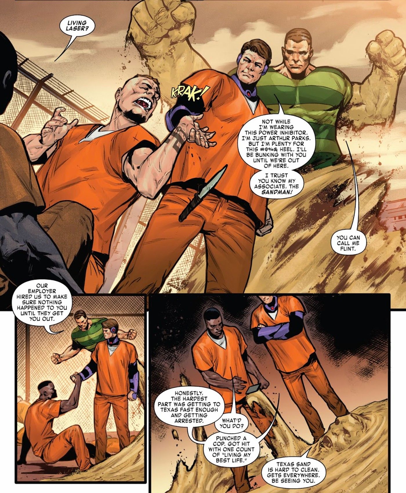 Los cómics cierran el círculo de las heroicas ambiciones de Sandman. El hombre de hierro invencible #10 de Gerry Duggan, Juan Frigeri, Bryan Valenza y Joe Caramagna de VC. Durante esta serie, el mejor amigo de Tony Stark, Rhodey, fue encarcelado por intentar ayudar a Iron Man a destruir Stark Unlimited, ahora propiedad del líder de Orchis, Feilong. Feilong intenta que sus compañeros de prisión maten a Rhodey, pero el nuevo amigo de Stark, el Rey Blanco Wilson Fisk del Hellfire Club, hace algunos arreglos.