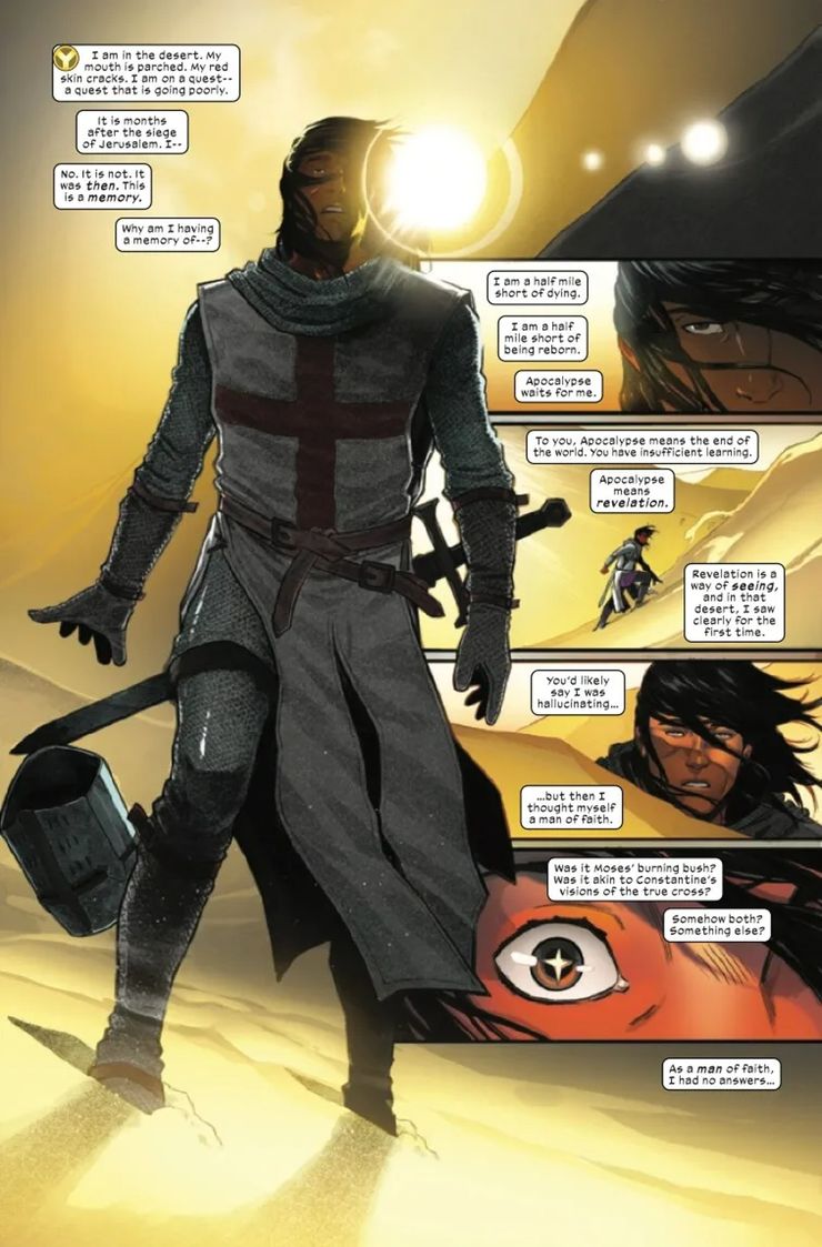 Ahora, en una vista previa de Inmortal X-Men #5 – escrito por AXE: Día del Juicio Final el arquitecto Kieron Gillen con el arte de Michele Bandini y David Curiel: el pasado de Bennet en el desierto se explora una vez más en una especie de regresión de la memoria. Sin embargo, en lugar de encontrarse con la Bestia Escarabajo que provocó la manifestación de sus poderes en caballero negro: éxodo, el joven Bennet parece ver una manifestación de la poderosa Fuerza Fénix.