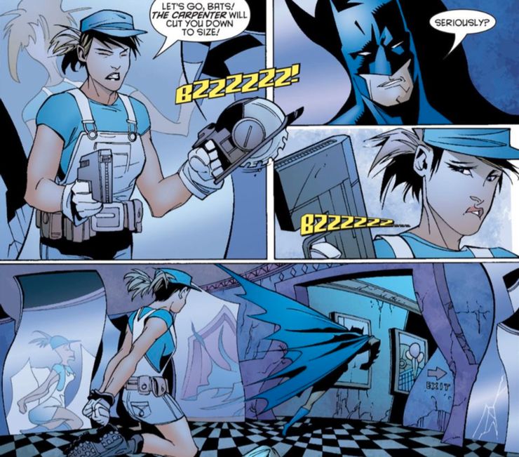 Pero a pesar de todos los Eggheads y Book Worms con los que Batman se ha encontrado, ninguna compañía de villanos estuvo tan desprovista de sustancia como Wonderland Gang que debutó en Cómics de detectives #841 por Paul Dini, Dustin Nguyen, Derek Fridolfs, John Kalisz y Randy Gentile. Mad Hatter lidera un equipo de antagonistas de temática similar, todos modelados a partir de personajes de Através del espejo. Aparte de Tweedledum y Tweedledee, la mayoría de la pandilla son nuevos criminales que se han unido y han asumido identidades a medias como March Hare, Lion and the Walrus. La más subdesarrollada de la tripulación es Carpenter, también conocida como Jenna Duffy, una ex carterista de Keystone City. A diferencia de sus camaradas, Carpenter no es una gran luchadora, o una que lanza amenazas cuando se enfrenta a Batman. El Caballero de la Noche ni siquiera puede hacer un intento de tomarla en serio, simplemente esposarla y seguir adelante.