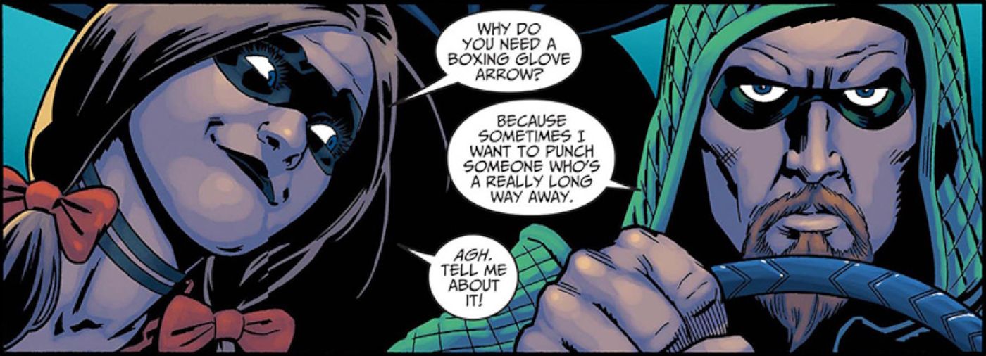 - Los lectores en ocasiones se han burlado del uso de flechas engañosas por parte de Green Arrow, pero resulta que incluso el Joker está impresionado por la practicidad de tales tácticas, al menos cuando se trata de la flecha del guante de boxeo.