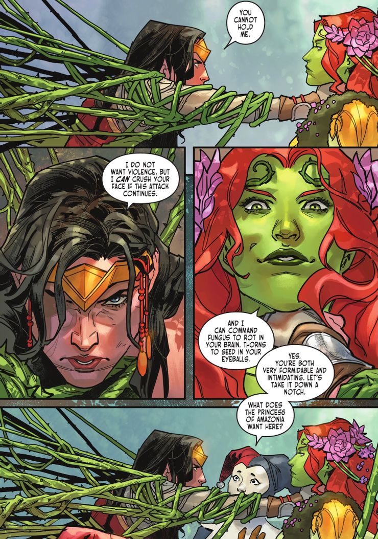 Esto trae las cosas a Caballeros Oscuros de Acero #5 donde se ve al bufón de la corte del Castillo de El, Harley Quinn, asegurando el apoyo de la “Dama del Bosque” (Poison Ivy) para la batalla que se avecina. Sin embargo, Wonder Woman que pasa por encima de la cabeza resulta en un altercado debido al hecho de que las Amazonas son vistas como rivales de las Els. Rápidamente envuelta en una multitud de enredaderas por Ivy, Wonder Woman naturalmente advierte al clásico enemigo de Batman que se mantenga fuera de su camino y amenaza con aplastarla. Sin embargo, Poison Ivy no está preocupada en lo más mínimo, revelando que podría incapacitar a Diana con una facilidad aterradora gracias a sus poderes brutales.