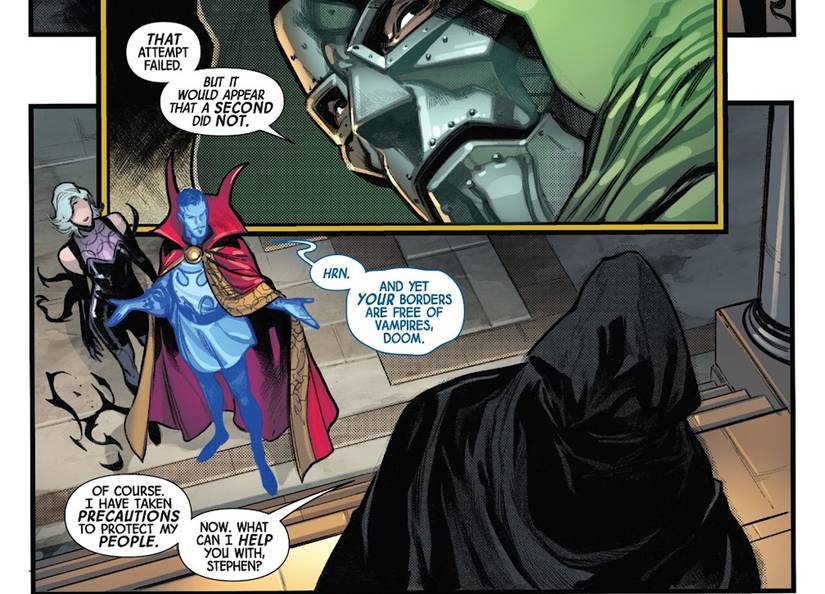 Tras salir de su imprescindible serie limitada, Blade es poseído por el primer vampiro de la cultura pop, eclipsando al Universo Marvel en la oscuridad. Una Clea Strange desesperada y un Doctor Strange que acaba de perder su cuerpo (gracias a que Blade lo mató) acuden al Doctor Doom en busca de ayuda contra esta nueva fuerza del mal. La nación latveria del dictador está sorprendentemente libre de vampiros, a diferencia del resto del mundo, todo porque Doom ha tomado “precauciones,” Aunque no revela detalles, Strange advierte a Doom sobre la Fuerza Oscura que se avecina, a lo que Doom le corrige diciendo que también ha creado “precauciones” Contra la Fuerza Oscura.