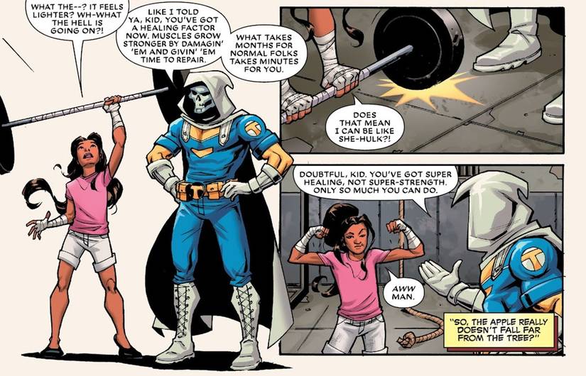 Sin embargo, lo que es especialmente notable no es la victoria de Ellie, sino la observación de su compañera de entrenamiento sobre sus habilidades. En media hora, Taskmaster hace que la joven de 14 años se comprometa a realizar varias superseries de levantamiento de pesas. Ellie está comprensiblemente agotada, pero pronto es capaz de levantar la barra por encima de su cabeza con una mano.. Como explica Taskmaster, Su factor de curación permite que sus músculos crezcan más rápido y más fuertes una vez que se reparan del daño.. “Lo que a la gente normal le lleva meses, a ti te lleva minutos”. él afirma.