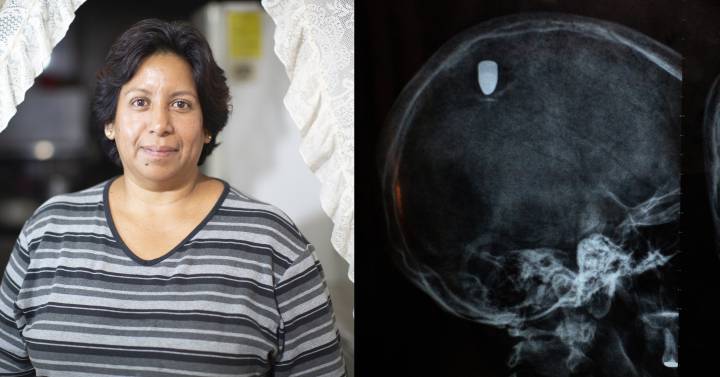 El sobre de Fidel contiene placas y tomografías. “Todas las guardé”, dice orgulloso. Sin esos estudios -el cráneo de su esposa y un proyectil dentro del cráneo, vistos de frente, de perfil, de arriba, de abajo- sería difícil creer a Lourdes. Quizá Fidel lo haría. Y los tres hijos de ambos, que aquella noche iban con ellos. Pocos más, porque su historia es verdaderamente increíble. La noche del 1 de enero de 2010, antes de entrar en casa, un bala cayó del cielo y golpeó la cabeza de la mujer, hundiéndose un par de centímetros. Pese a las pocas posibilidades de sobrevivir a un balazo en la cabeza, Lourdes lo hizo. Le sacaron la bala, siguió adelante. “El doctor me dijo que se quedó a milímetros de tocar el cerebro”, dice Fidel, “si lo llega a tocar se muere”. Nueve años más tarde, recuperada la movilidad perdida, el cabello cubriéndole el cráneo de nuevo, la mujer sufre de migraña tres o cuatro veces al mes. Nada más.