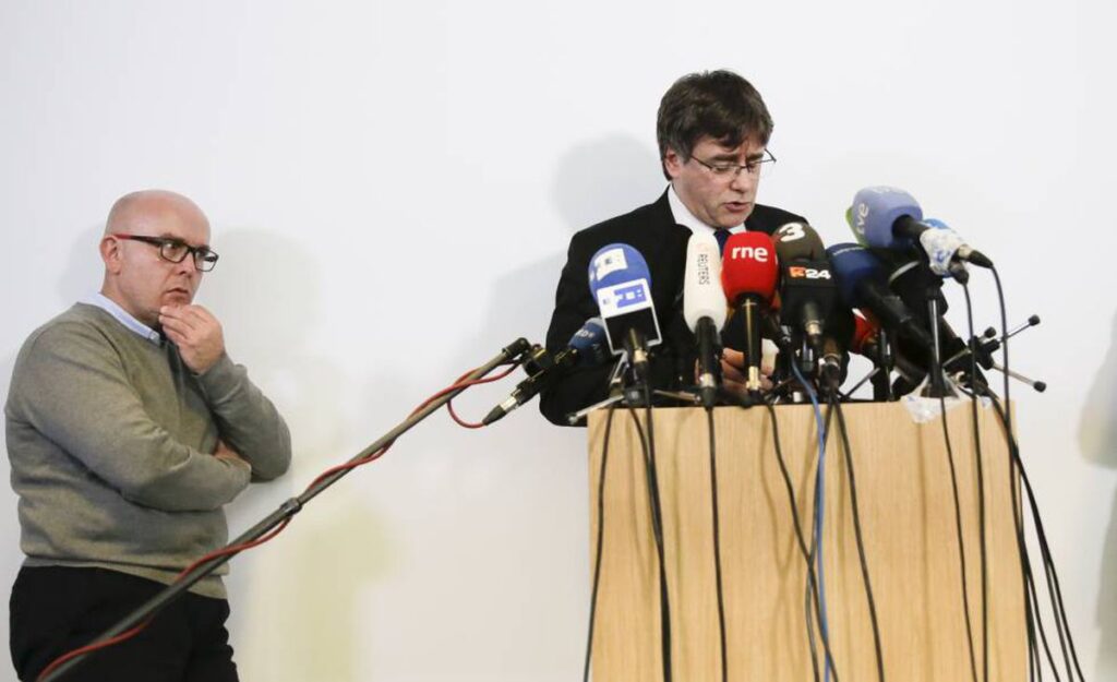 Carles Puigdemont, acompañado del abogado Gonzalo Boyé, en una rueda de prensa en Berlín, en febrero de 2019.Associated Press
