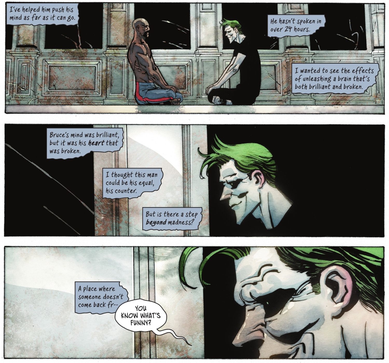 Batman (2016) El número 143 hace un excelente trabajo al presentar al Joker como una fuerza sobrenatural y malévola. Cuando un amargado Daniel Capito se ofrece a entrenar al Joker, poco después de su primera aparición en Gotham, el antiguo mentor de Batman queda impactado por la oscuridad que alberga el Payaso y reflexiona: “No creo en el Cielo ni en el Infierno, pero si lo hiciera, pensaría que este hombre ha existido durante milenios, atormentando a la humanidad.“