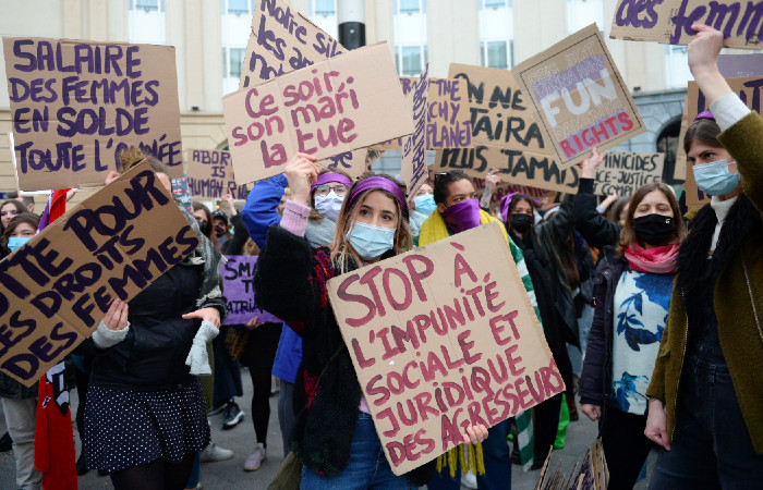 Mujeres sostienen pancartas durante una manifestación para pedir la igualdad de género y exigir el fin de la violencia contra las mujeres en Bruselas, Bélgica, el 8 de marzo. | Foto: Reuters
