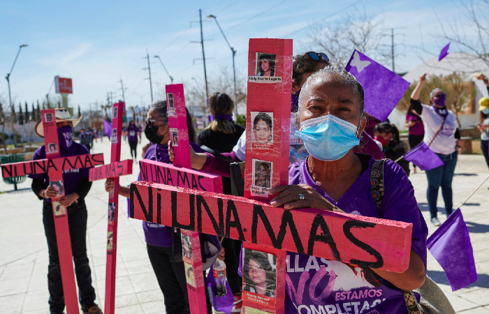 Madres sostienen cruces con un cartel que dice: “Ni una más” durante un evento que exige el fin de la violencia contra las mujeres y el feminicidio, antes de una protesta por el Día de la Mujer, en Ciudad Juárez, México, el 7 de marzo.| Foto: Reuters