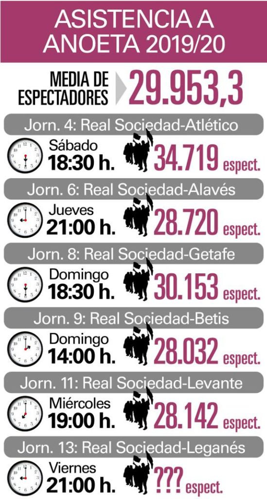 Los txuri urdin estrenan horario, el viernes a las 21 horas, y parece claro que la hinchada responderá porque el segundo encuentro en casa lo disputaron un jueves, un día más canalla para la asistencia por ser laboral el siguiente, y acudieron la friolera de 28.720 aficionados a ese choque ante el Alavés.