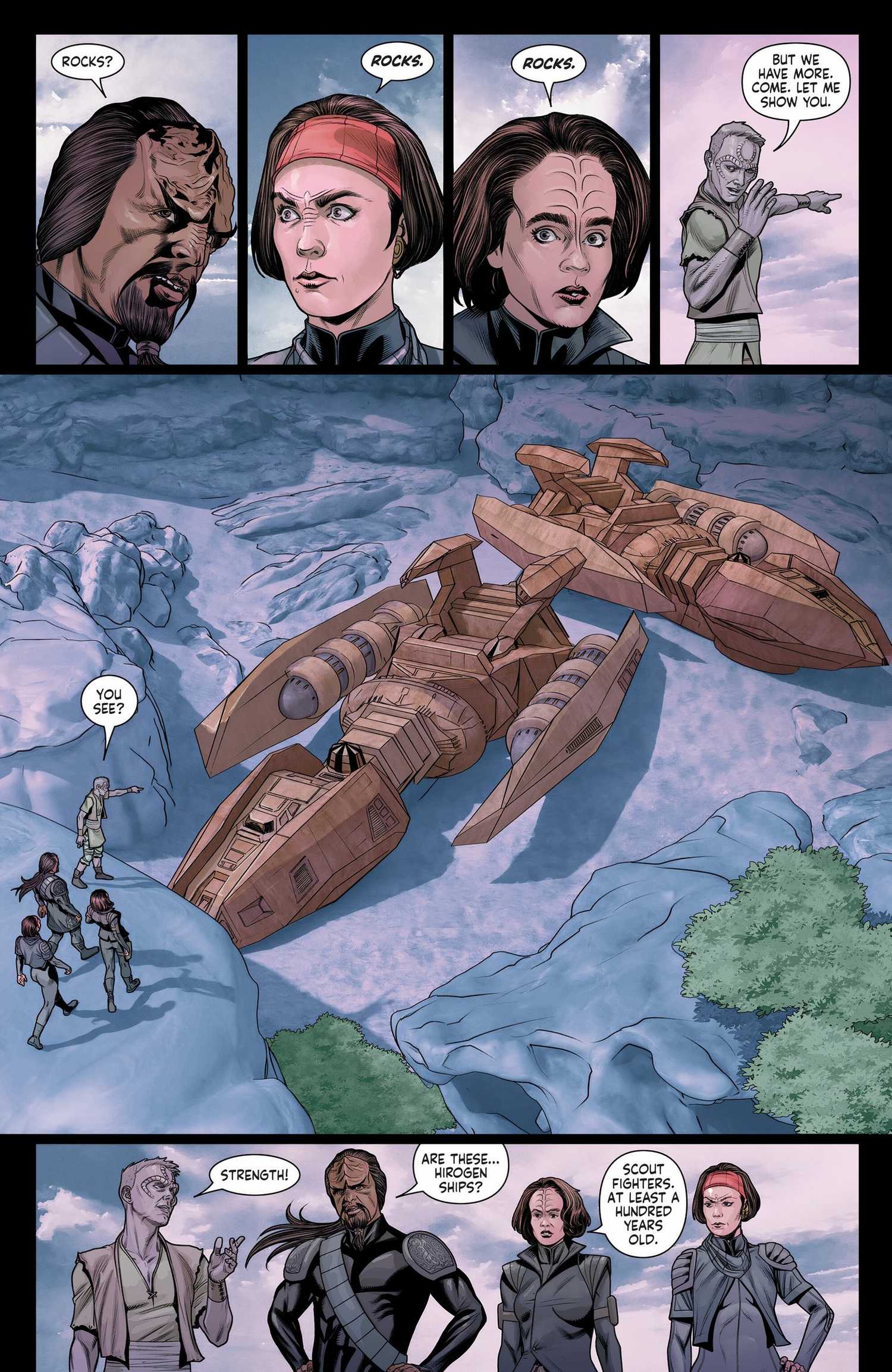 Star Trek: Desafiante El número 18 está escrito por Christopher Cantwell y dibujado por Angel Unzueta. Worf, Ro Laren y B’Elanna Torres están en el mundo natal de los Antaran, en el borde del Cuadrante Delta. Los romulanos están llegando a Antara para despojar al planeta de su tecnología restante, y Worf debe organizar a los habitantes agrarios para contraatacar. Sin ser optimista sobre sus perspectivas, Worf sigue adelante. Uno de los Antarans lleva a Worf a un claro, donde se encuentran dos asaltantes Hirogen.