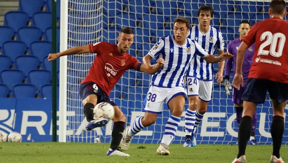 López y Olasagasti se adueñaron del balón, Osasuna comenzó a desesperarse. Olasagasti lo hizo fácil, control con la derecha y distribución con su delicada pierna izquierda. También fue capaz de conducir y driblar rojillos como si estuviera jugando en el Z4 de Zubieta. Los rivales le cogieron la matrícula y él no dudó oxigenando al equipo con diagonales de 30 metros que siempre encontraron destinatario. Un buen pase suyo originó la jugada más peligrosa de la primera parte después de que Näis sacara la chistera en banda.