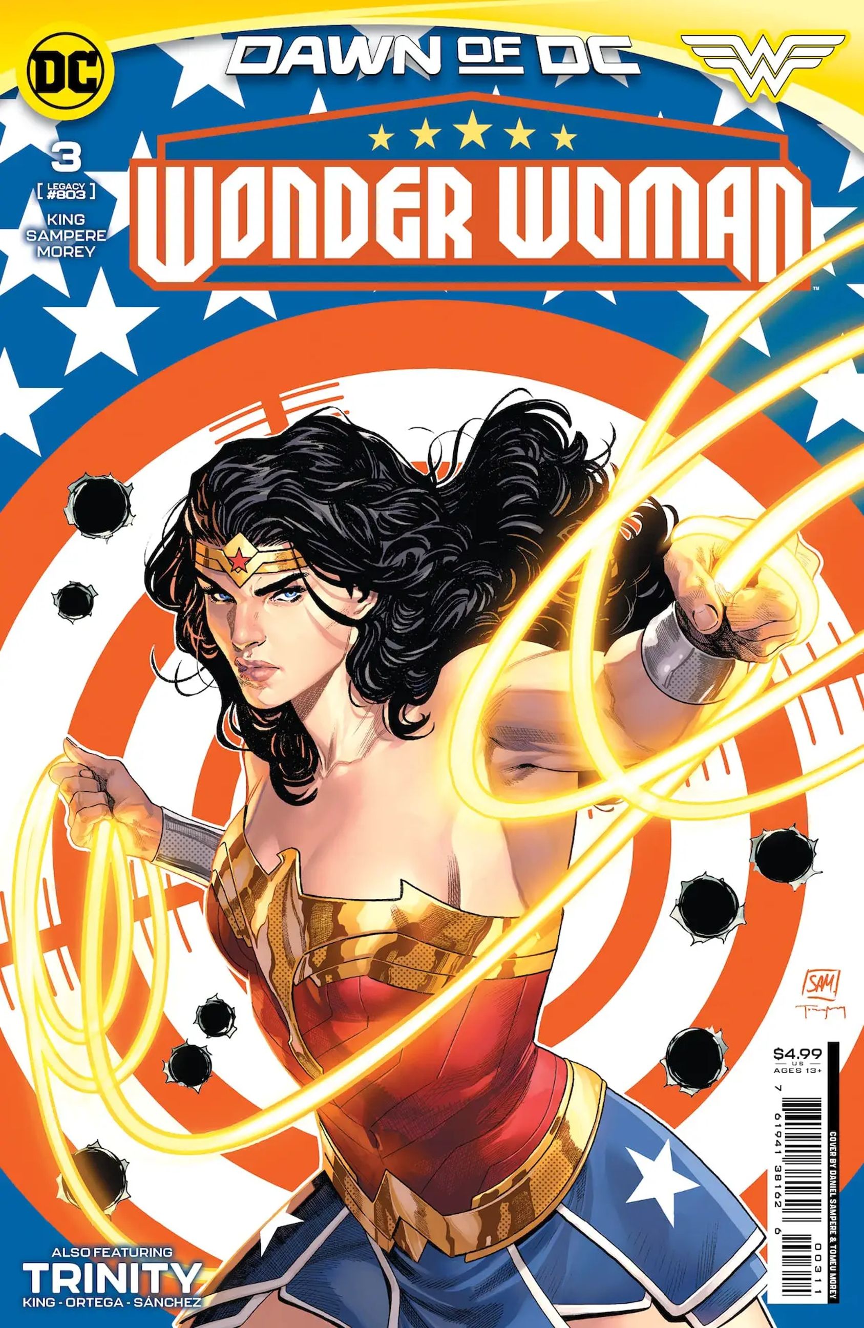 En un avance iletrado para Mujer Maravilla #3 Por Tom King y Daniel Sampere, un grupo de soldados espera afuera de un ascensor para arrestar a Wonder Woman. Cuando el ascensor llega al piso de los soldados, ella con calma se quita la tiara y la arroja por la puerta.