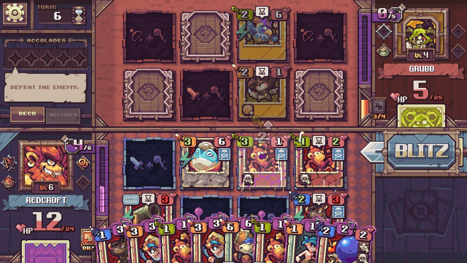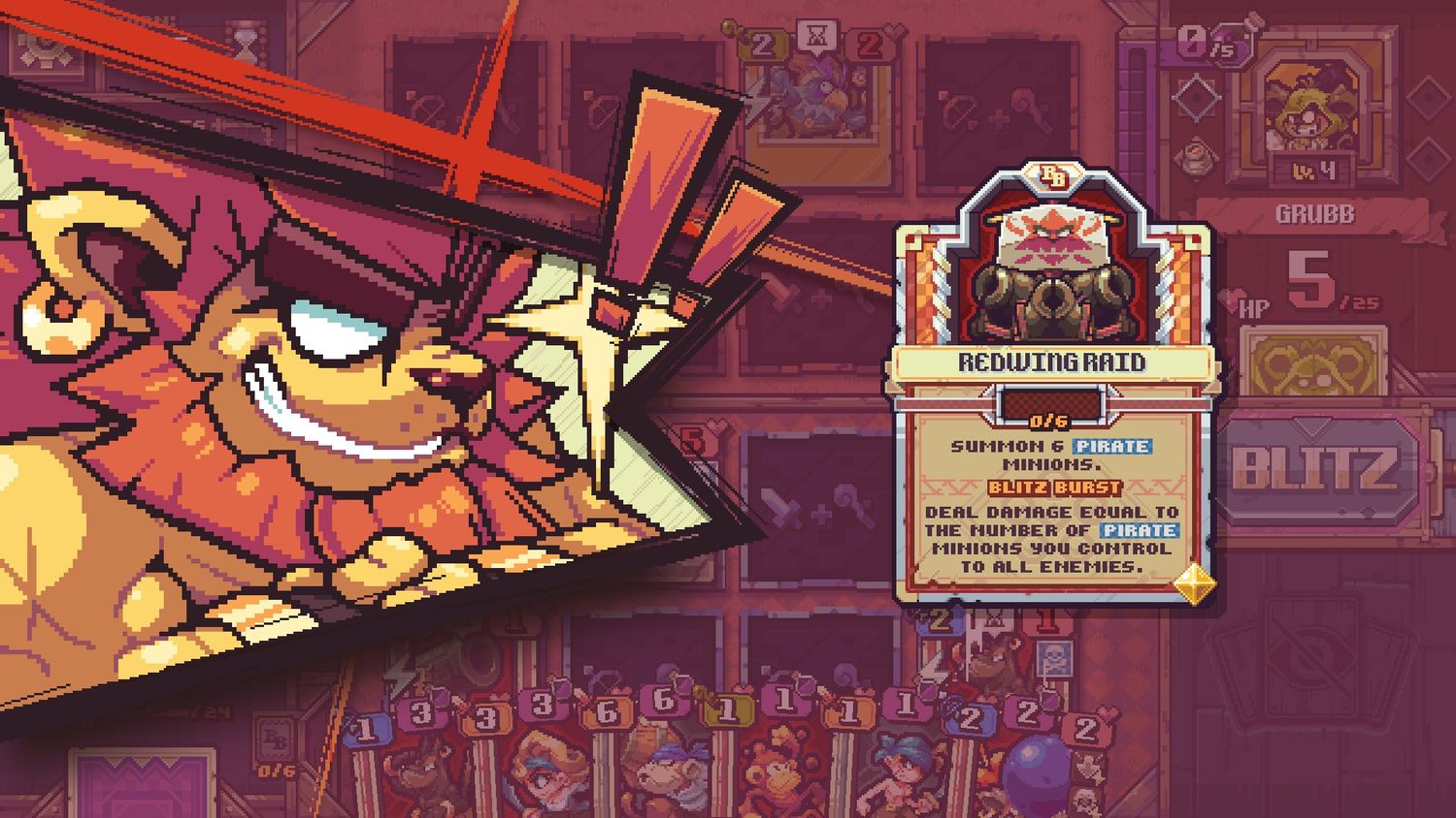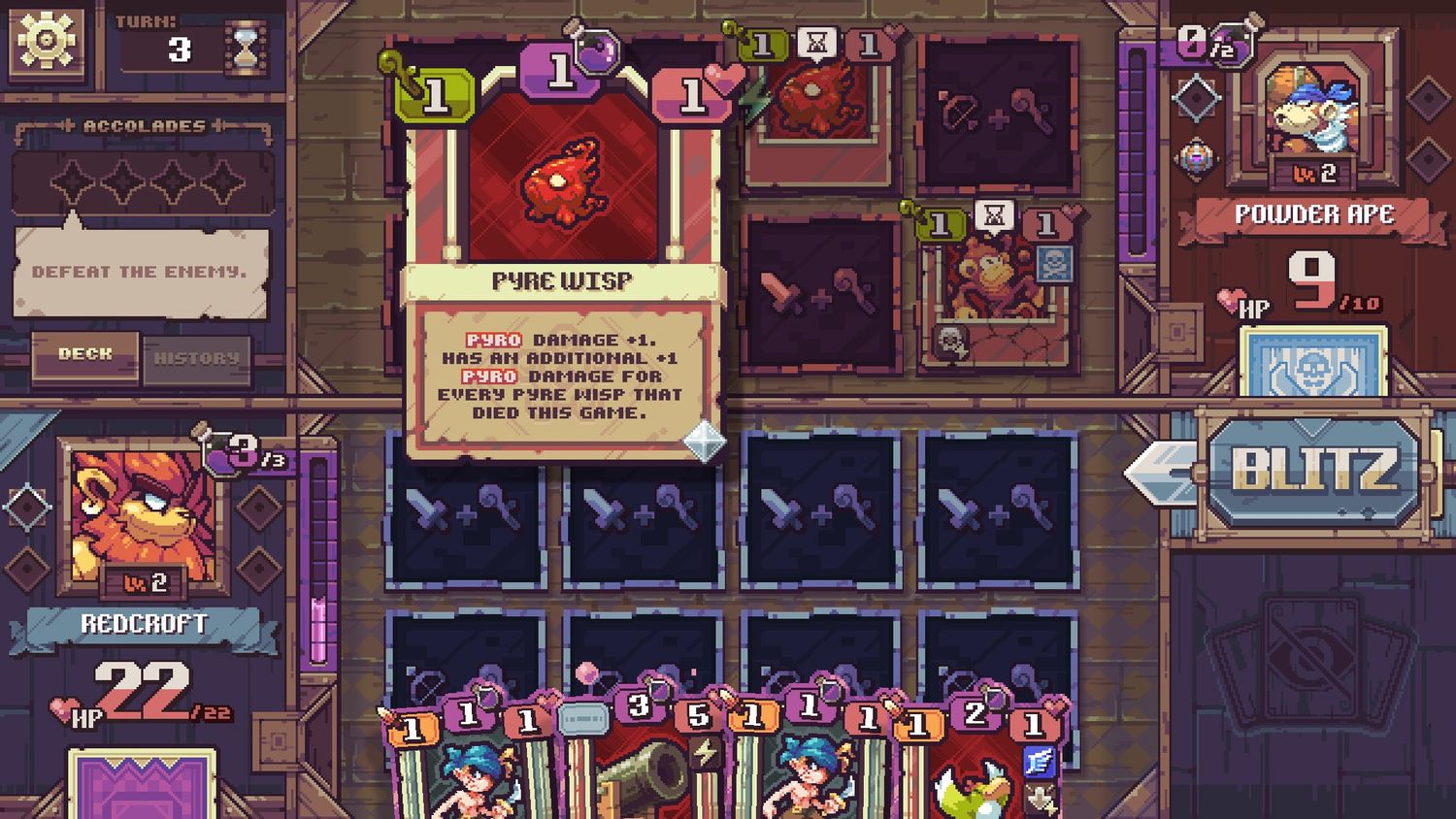 Las condiciones más complicadas diferencian cada duelo, como cartas trampa que crean nuevas condiciones en ciertos carriles cuando se activan. Algunos de Bombardeo cruzadoLos enemigos de llegan con reliquias que dañan a cualquier esbirro después de jugarlas, lo que significa despedirse de cualquier carta pirata de un HP que se haya puesto en el tablero. Los súbditos pueden lanzar curaciones, activar cartas de cañón para disparar o rellenar los mazos de los oponentes con cartas de estado que induzcan daño, y las habilidades especiales de Blitz específicas de héroes cierran los partidos en un centavo.