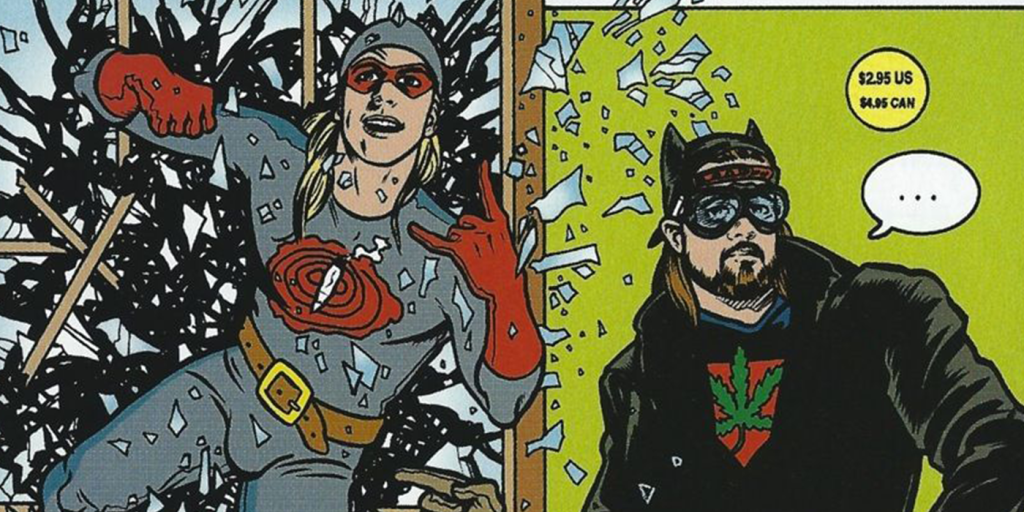 Los libros obtienen meta desde el principio, y se les da crédito creativo a Banky Edwards y Holden McNeil, los creadores de (en ese momento) libros de ficción en Chasing Amy, interpretados por Ben Affleck y Jason Lee, respectivamente, con los dos actores. incluso escribiendo el epílogo del libro. El cómic de la vida real fue escrito por Smith, con arte de Michael Avon Oeming y Neil Vokes (y diseñado por Mike Allred). Las historias llevan el amor de Smith por los cómics en sus mangas, con el primer número haciendo referencias abiertas a las historias de origen de héroes icónicos como Green Lantern, Spider-Man y Daredevil. En la búsqueda de drogas gratis, el dúo incluso casi recibe un Suero Super Soldado Capitán América, después de un anuncio de pruebas voluntarias de drogas. Pero se retiraron, manteniendo sus principios de que no se meten con los inyectables. “Somos Stoners. Nos encendemos. No disparamos S% * t”, dice Jay cuando la pareja sale del laboratorio. Bob no dice mucho.