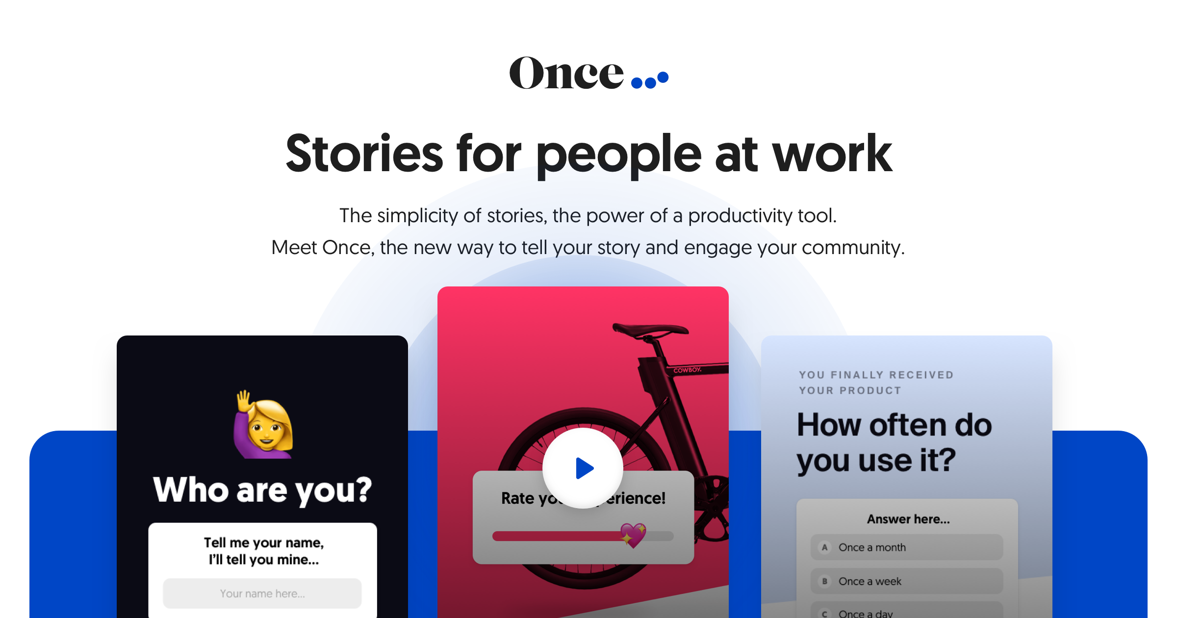 Una vez Es una nueva versión de las presentaciones visuales. Le permite crear historias usando una interfaz de arrastrar y soltar y generar un enlace para enviar sus historias a sus clientes. Una vez es compatible con todo lo que esperarías de una historia de Instagram, como imágenes, texto, encuestas y controles deslizantes.