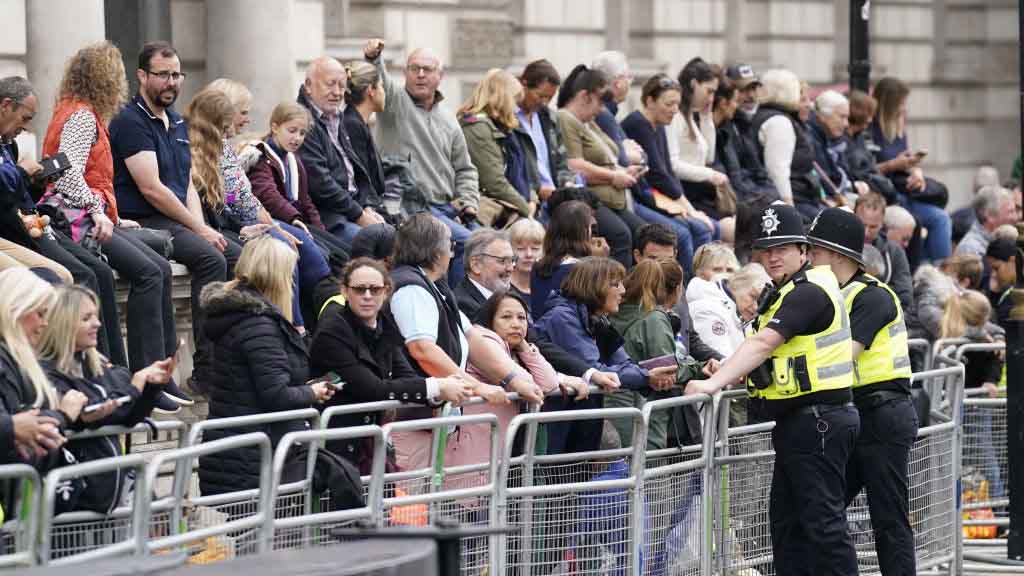 La gente se paraba detrás de las barreras de metal o se sentaba en sillas plegables, sombrillas listas, cafés para llevar en la mano bajo un cielo gris horas antes de que el ataúd saliera del emblemático palacio a las 2:22 p.m.