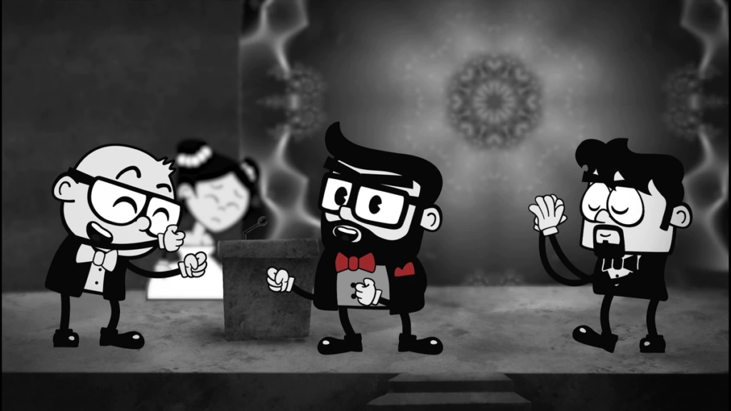 Tras diez minutos de metraje en los que aparecen los tres cineastas en formato dibujo contando la sorpresa de La gallina Turuleca (había sido la única película que había entrado en la preselección de los premios de la Academia española del cine, y en consecuencia la única candidata, así que sus creadores tenían el discurso ya escrito), comienzan sus aventuras en una doble vertiente: por un lado elucubran con que llegan a la ceremonia y se enfrentan a una poderosa rival, Supercampeones, parodia de Campeones, de Javier Fesser, aunque con directora y en animación; por otro, juegan con atajos (un reloj cronometra cada vez que ellos aparecen en carne y hueso para no superar el porcentaje), formatos, velocidades, y piden ayuda gratuita para rellenar minutos de animación, mientras revelan al espectador secretos de la industria y de los galardones: como que las marionetas no se consideran animación. Por cierto, el Goya automático solo acaeció el año pasado durante este siglo XXI, pero en el XX ocurrió cuatro veces y hubo ediciones en que quedó desierto por falta de aspirantes el cabezón a largo de animación. “Una pena, porque la industria de la animación en España está llena de talento”, recuerda Dharma.