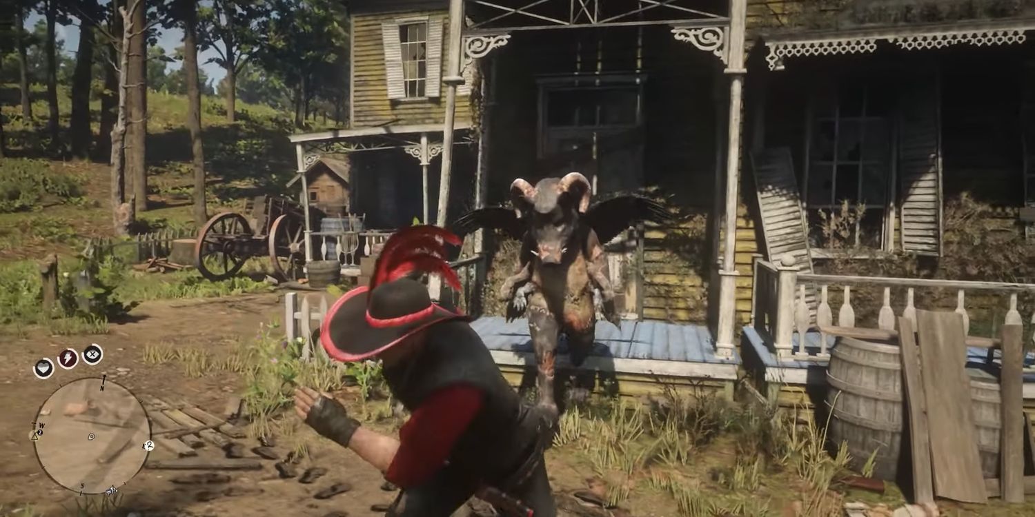 Mientras Arthur explora el área al oeste del puesto comercial Van Horn, puede encontrar una casa decrépita que contiene RDR2El mayor horror: el mutante creado por el hombre.. A primera vista, parece un minotauro crucificado: un cuerpo humanoide con cabeza de jabalí, cuernos de carnero… espera, ¿son alas? Como resulta, El mutante hecho por el hombre no parece contener ninguna parte humana.. Está todo improvisado con apéndices de varios animales, con el estómago de una oveja, las patas delanteras de un oso y las alas de un buitre. Parece estar atado a una especie de mesa quirúrgica y sus brazos están suspendidos del techo en posición extendida.