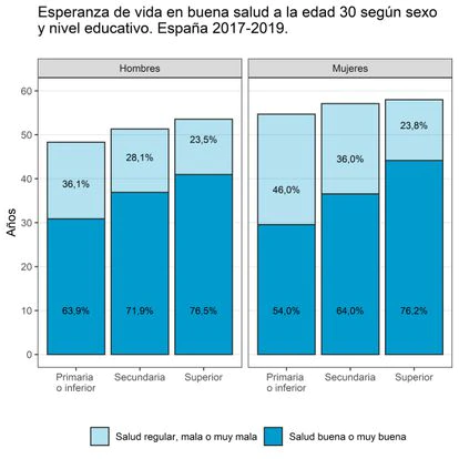 La esperanza de vida en un país está condicionada por la alimentación, los servicios sanitarios y la educación. Sin embargo, hasta ahora en España no se habían cruzado de forma simultánea y en todo el territorio los datos de mortalidad, calidad de la salud y nivel formativo. Lo ha hecho por primera vez la Universidad Autónoma de Barcelona con datos del Instituto Nacional de Estadística de 2017 a 2019. En el artículo Vivir menos y con peor salud: el peaje de la población menos instruida de España, Amand Blanes y Sergi Trias-Llimós, del Centro de Estudios Demográficos (CED), calculan que a los 30 años un varón con estudios superiores tiene una esperanza de vida de cinco años más que uno con formación primaria: 83,5 años frente a 78,4. En el caso de las mujeres, la desigualdad se acorta a poco más de tres años. A los 30 años, una mujer con título universitario puede aspirar a vivir hasta los 88 años, frente a los 84,9 de las poco formadas. A más años de vida, las desigualdades se atenúan.
