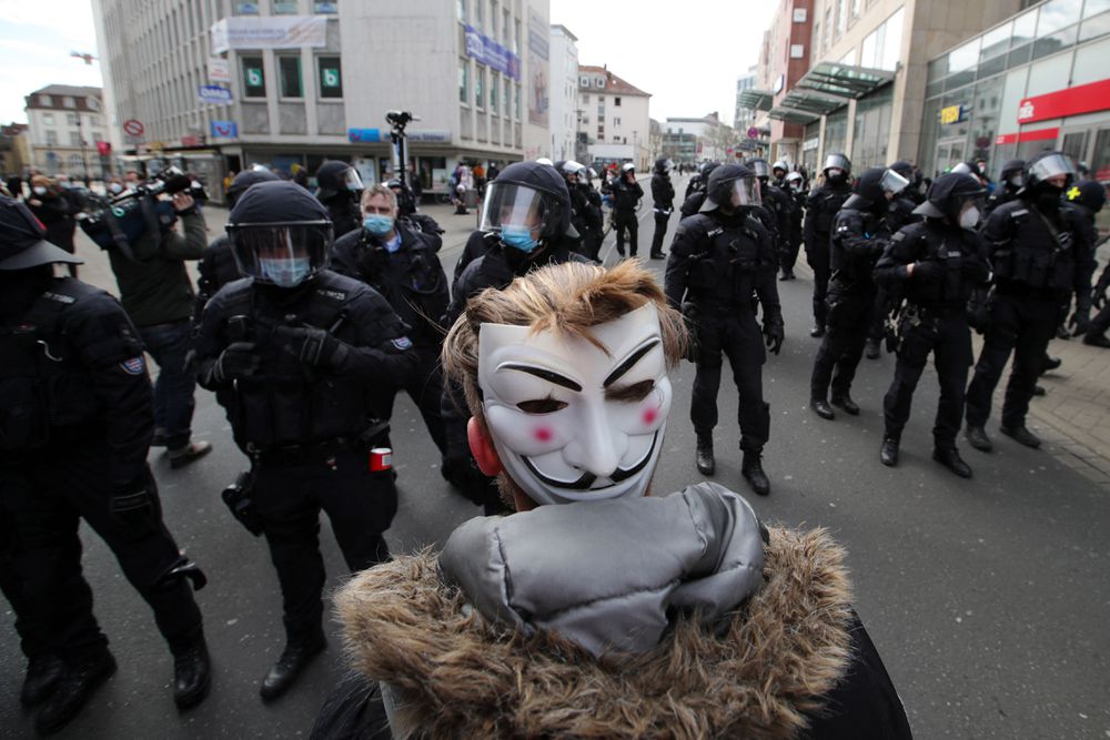 Un manifestante con una máscara de Guy Fawkes se coloca delante de los agentes de policía en Kassel (Alemania), este sábado.