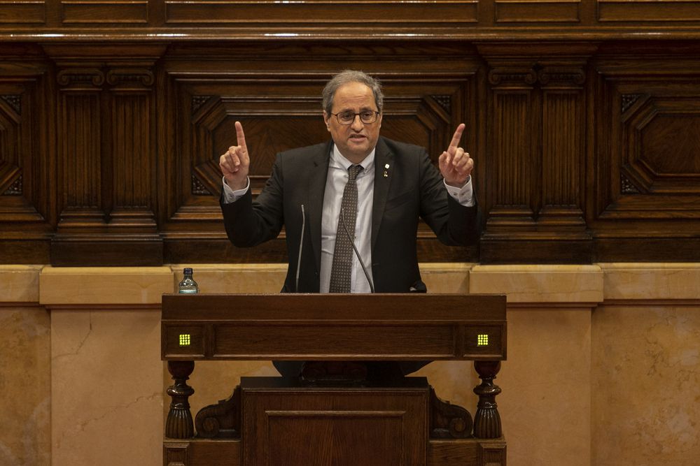 En su intervención construyó uno de sus discursos más ariscos. Volvió a insistir en que había sido inhabilitado durante 18 meses por colgar una pancarta en favor de los “presos políticos y exiliados” e insistió —por enésima vez— en que, con ese fallo, se le priva de su derecho a la libertad de expresión. La realidad es que se le condenó por desobedecer a la Junta Electoral al no retirar la pancarta de la fachada del Palau, que exhibía un símbolo considerado partidista por la autoridad electoral, cuando fue requerido.