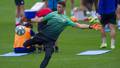 Lo más llamativo de la matinal ha sido el trabajo que ha realizado Unai Simón, el actual titular portero del Athletic. Junto a Aitor Iru ha estado afinando su golpeo de balón. Quizás el aspecto a pulir que ha dejado ver en las primeras jornadas. En largo, corto, de más precisión, presionado por el rival… Ha practicado varias especialidades.