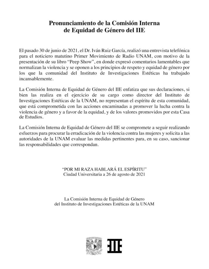 La Comisión Interna de Equidad de Género del Instituto de Investigaciones Estéticas de la Universidad publicó un pronunciamiento en el que calificó como “lamentables” los comentarios vertidos por el académico durante la transmisión del noticiero matutino Primer Movimiento de Radio UNAM.