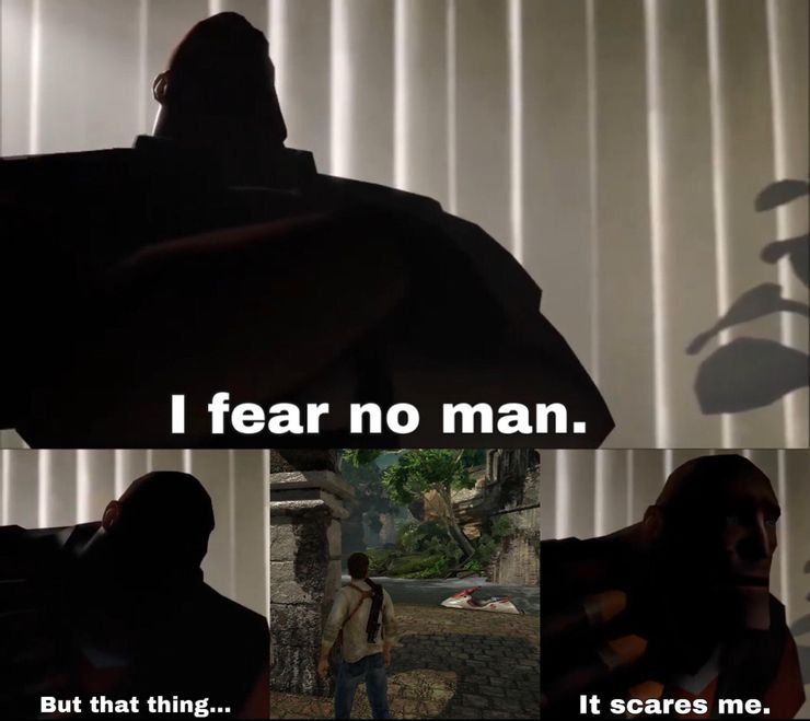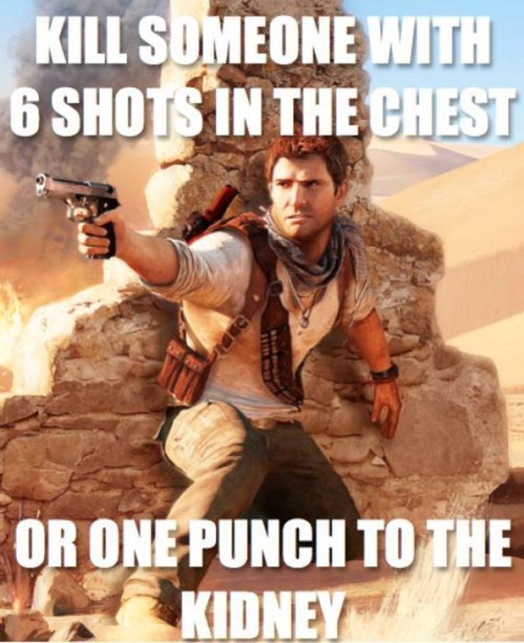 El meme recuerda uno de temática similar que describía con precisión la polaridad de matar a un tipo malo desde lo sumamente fácil hasta lo casi imposible, donde incluso cuando se le ordena a Drake que no mate a nadie con un arma de fuego en el museo, simplemente puede lanzar un enemigo desde el techo con los mismos resultados. Es otro poco ilógico que rasca la cabeza que tipifica la franquicia.