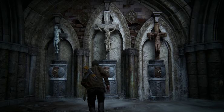 Baja las escaleras ocultas para descubrir la extensa cripta subterránea de Henry Avery. Un conjunto de estatuas se sientan al final del pasillo que representa a tres hombres crucificados. Después de examinar las estatuas, dirígete a la parte trasera de la pared de la estatua. Se desencadena una escena en la que Sam enciende una vela que ilumina la parte trasera de la pared, revelando seis haces de luz. Regrese a las estatuas para manipular los rayos de luz de manera similar al rompecabezas Shiva Light Beam en Inexplorado 4.