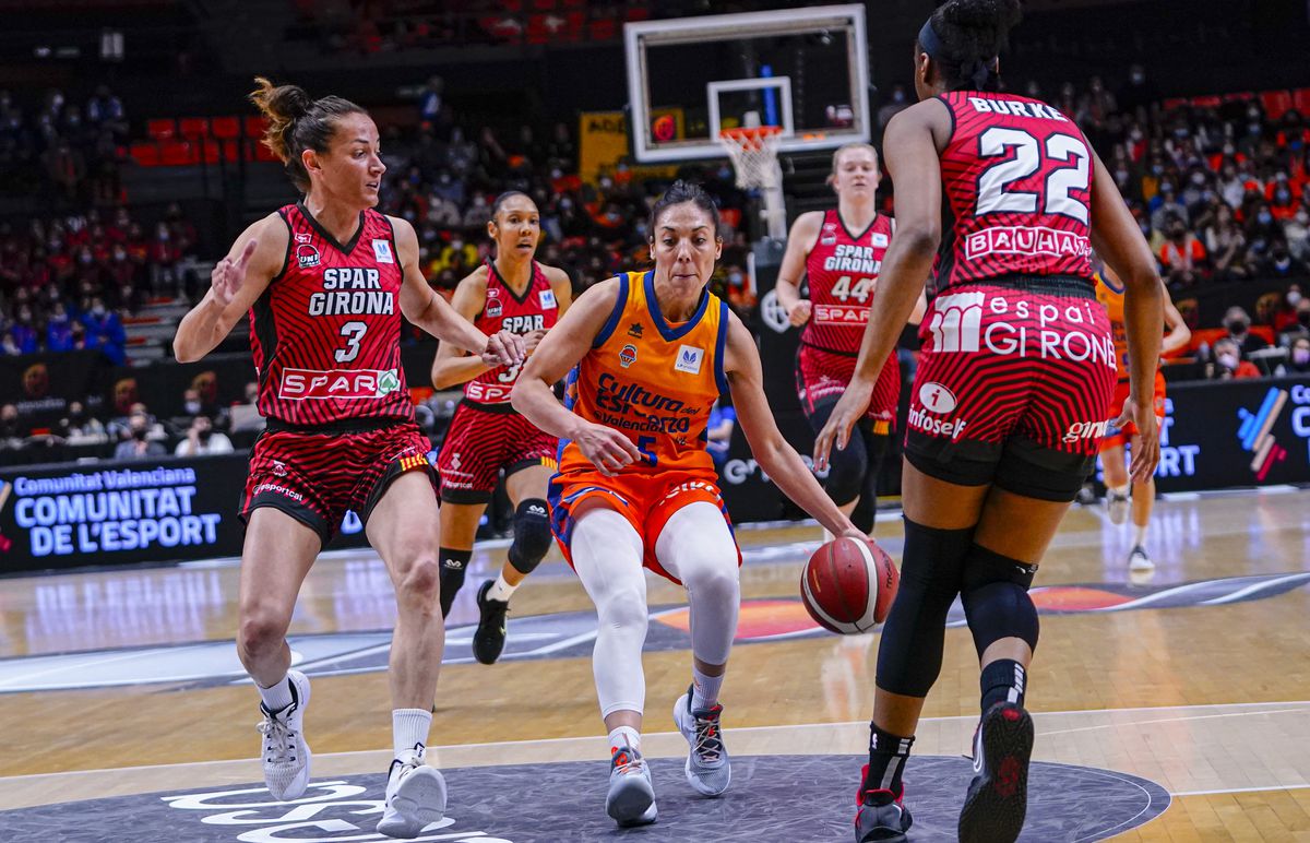 Acto seguido, saltaron a la pista el Valencia Basket y el Uni Girona para reeditar la final de la temporada pasada en el escalón anterior. Las anfitrionas, lanzadas por Cristina Ouviña, protagonizaron una trepidante puesta en escena, sin reparar en bajas (Raquel Carrera, Laura Gil y Ángela Salvadores), minutos de tanteo, ni dosificaciones. Ouviña anotó 13 de los primeros 15 puntos de su equipo, con un 3 de 3 en triples en 7 minutos y puso en ebullición a La Fonteta. Mantuvo el tipo el Girona y, cuando bajó la efervescencia de Ouviña y la tensión defensiva marcada por Queralt Casas, llegó el momento de Frida Eldebrink y Michaela Onyenwere. Los puntos de ambas y el dominio de Kennedy Burke en el rebote permitieron al conjunto catalán hacerse con el dominio del marcador (27-34, m. 20).