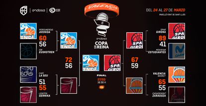 En la reanudación, Leticia Romero se asoció con Ouviña para redoblar la apuesta taronja y reajustar las cuentas (46-44, m. 29). Pero la personalidad de Laia Flores, con cinco puntos consecutivos y un triple sobre la bocina del final del tercer cuarto, sacó al Girona del atolladero y la igualdad se mantuvo hasta el minuto 34, cuando el conjunto catalán desplegó todo su talento. Magali Mendy, Giedre Labuckiene y y Michaela Onyenwere armaron un parcial demoledor. El Valencia no encontró el acierto de Rebecca Allen ni de Trahan Davis y el monumental partido de Cristina Ouviña (20 puntos, siete rebotes, seis asistencias y una recuperación, para un 28 de valoración en 32 minutos en pista) se quedó sin premio. El conjunto taronja, campeón de la Eurocup y de las Supercopas de España y Europa, se queda fuera de la pelea por la Copa de la Reina. La de esta edición será la segunda del Uni Girona o la décima del Perfumerías Avenida.