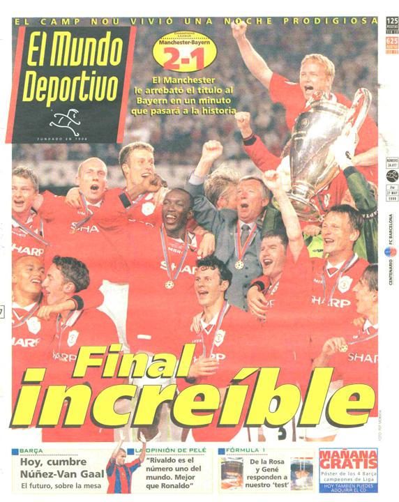 Si inesperado fue este gol más lo fue el 2-1 en el minuto 93 aunque fue de parecida ejecución. Beckham volvió a sacar un córner desde la izquierda, Sheringham cabeceó en el primer palo y Solskjaer puso la bota para empujar el balón y batir de nuevo al incrédulo Oliver Kahn.