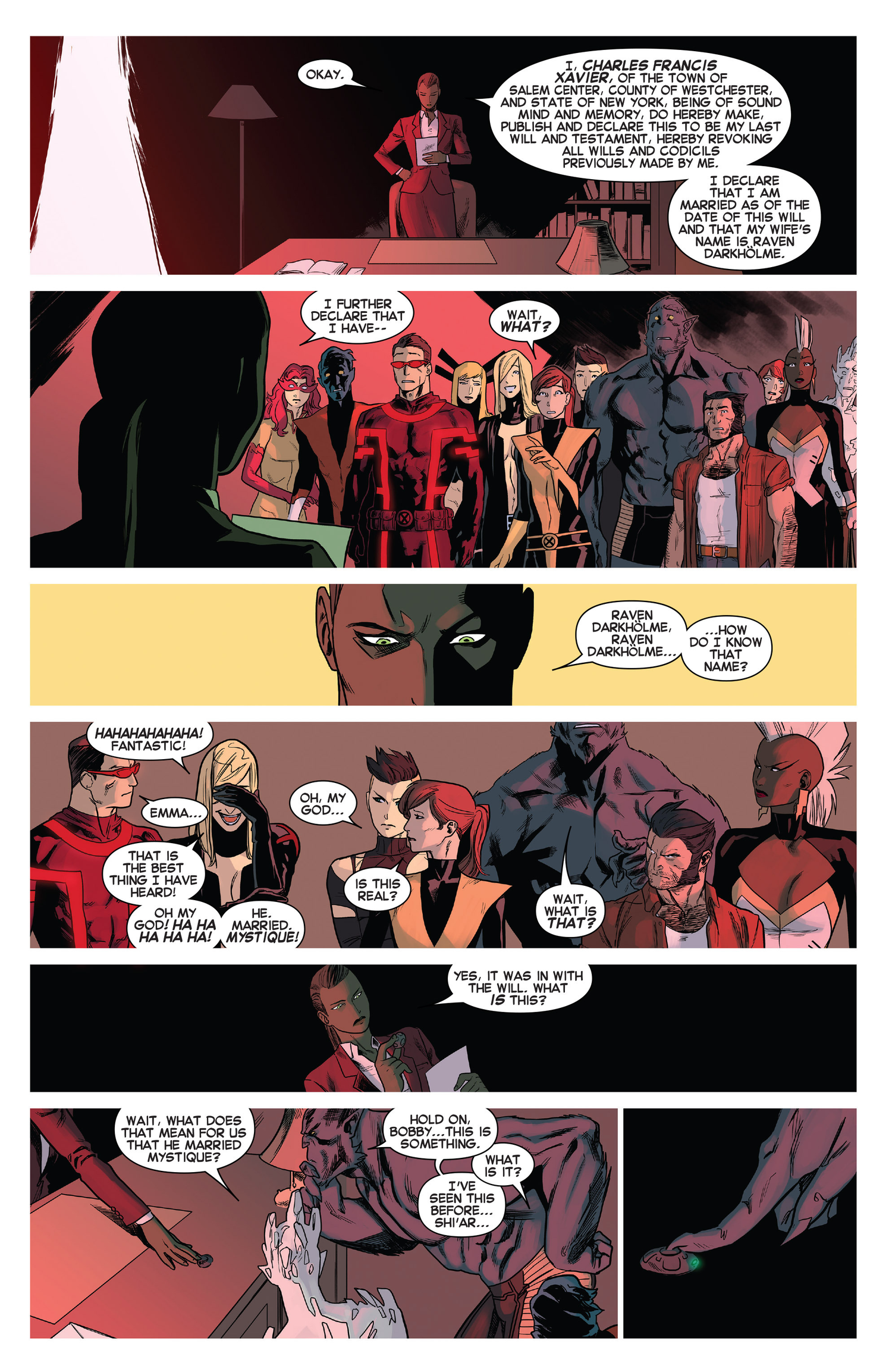 En el clímax de 2012 Avengers vs. X-Men evento, Xavier fue asesinado. En Asombrosa X-Men #24 (2014), sus alumnos se reúnen para la lectura de su testamentoque es entregado por la abogada Jennifer “She-Hulk” Walters. Esto llegó durante un período ya tenso para los X-Men, con una grieta creciente entre facciones mutantes, y el contenido del testamento solo se sumó a la incomodidad.
