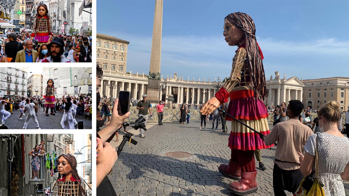 Ciudad del Vaticano.- La marioneta “Pequeña Amal”, de 115 pies de altura (3.5 metros) y que representa a una niña refugiada de nueve años, llegó este viernes a Roma y al Vaticano tras partir de la frontera turco-siria en busca de una nueva vida que la hará recorrer 5,000 millas en cuatro meses para inyectar esperanza a millones de migrantes.