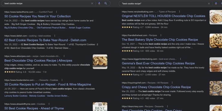El uso de comillas para realizar búsquedas en Google que arrojen los mejores resultados puede ser beneficioso cuando se requiere contenido muy específico. Por ejemplo, las personas que buscan recetas en línea usando lenguaje natural pueden verse abrumadas por la gran cantidad de resultados que arroja una búsqueda normal en Google. Sin embargo, escribir una búsqueda particular como “la mejor receta de galletas” puede generar resultados de páginas web en los que los usuarios han escrito la frase exacta en la página de comentarios de la receta. Este simple ajuste reduce drásticamente los posibles resultados de búsqueda, muestra las opciones más relevantes y hará que seleccionar una para probar sea una tarea menos abrumadora.