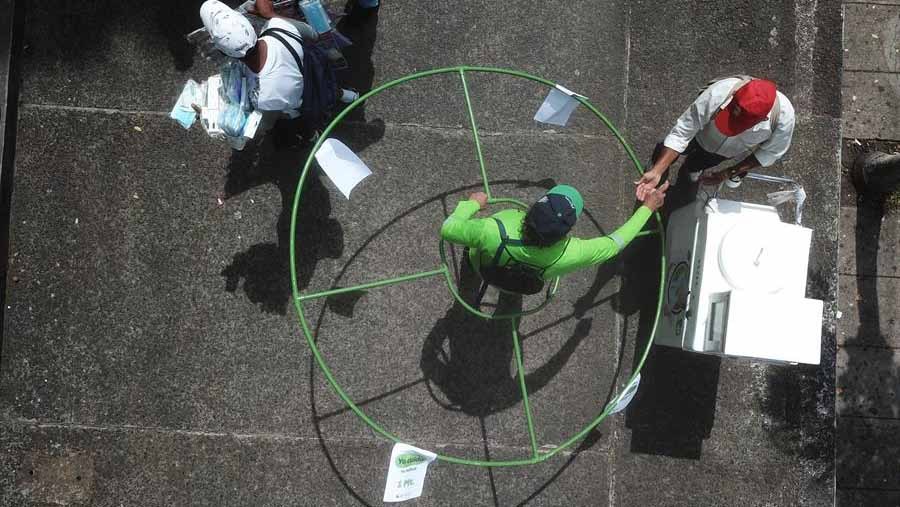 Juan Carlos Gutiérrez, quien se identificó como un agente de cambio, explicó este martes a Efe que el proyecto consiste en que cada voluntario porta en su cuerpo una rueda ‘hula-hula’ elaborada de PVC (cloruro de polivinilo) y de aproximadamente 2 metros de ancho y se pasea por los puntos de mayor concentración “para separar a las personas”.