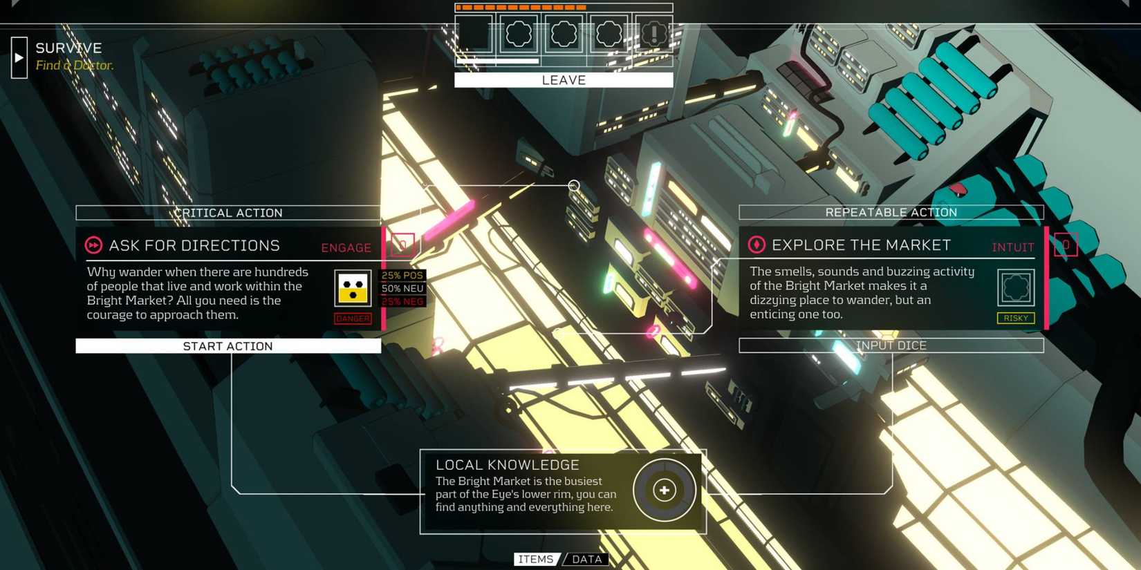 El jugador es libre de explorar la estación espacial, buscando soluciones a sus crecientes problemas. La estación está dividida en diferentes ubicaciones, y la mayoría requiere el uso de dados para activarse, cuyo éxito o fracaso depende de esos dados. La cantidad de dados disponibles está determinada por factores como el hambre y la estabilidad central, mientras que su efectividad está dictada por el número tirado en los dados al comienzo del ciclo. Es un acto de equilibrio complicado, con el núcleo infinitamente degradante que empuja al jugador a encontrar soluciones cada vez más desesperadamentecreando a menudo situaciones que parecen casi desesperadas.