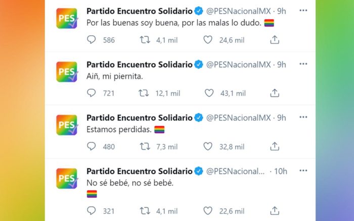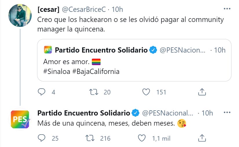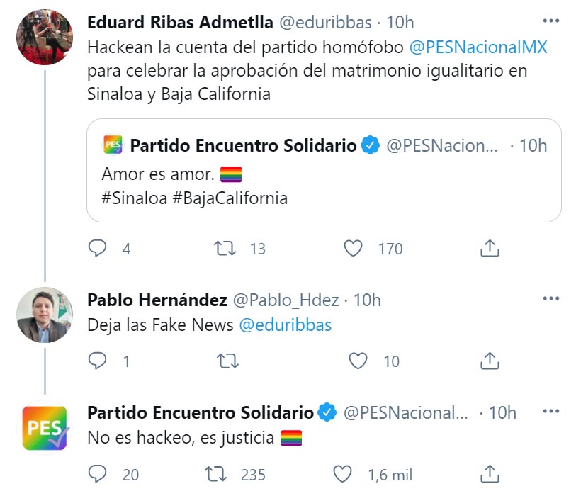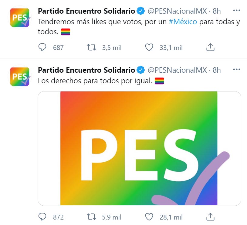 Además, desde las cuentas del PES en Twitter y Facebook difundieron mensajes de apoyo al matrimonio entre personas del mismo sexo, aprobado este miércoles en Sinaloa y en Baja California.