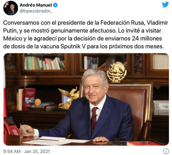 Por su parte, el Kremlin dio a conocer que Putin le deseó una pronta y completa recuperación al jefe del Ejecutivo mexicano, quien el domingo confirmó que dio positivo a Covid-19.