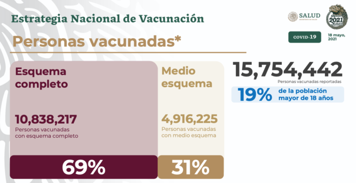 López-Gatell Ramírez indicó que hasta el momento han sido vacunados 15 millones 754 mil 442 personas pertenecientes a los grupos de mayores de 50 años, personal educativo y de salud, así como mujeres embarazadas, lo que representa que 19% de la población elegible ya tiene al menos una primera dosis de la vacuna.