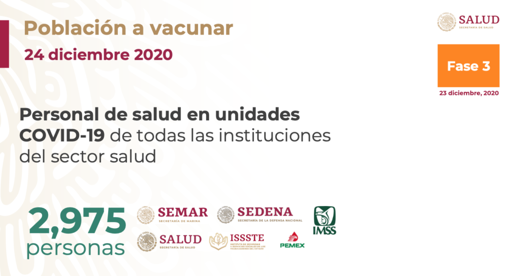 El subsecretario de Salud explicó que mañana jueves se aplicarán dosis a 2 mil 975 trabajadores de la Salud de la Secretaría de Marina, de la Salud, de la Defensa Nacional, ISSSTE, IMSS y Pemex.