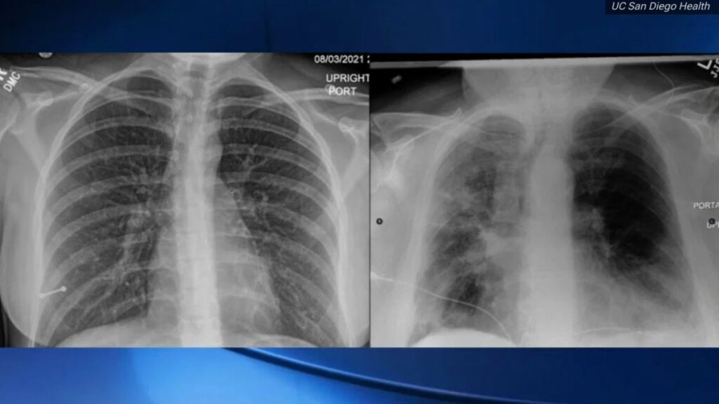El doctor Tim Morris, un especialista en pulmones y en terapia intensiva de la Universidad de San Diego, dijo que no es necesaria una capacitación técnica para ver la diferencia: en la izquierda están los pulmones de una persona vacunada contra el COVD-19 y en la derecha, la del paciente no vacunado, según reporta NBC Bay Area.