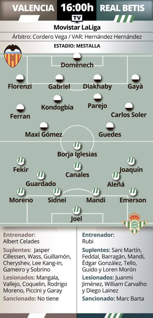 El Betis, por su parte, solo ha ganado uno de sus nueve últimos partidos de Liga y parece fuera de cualquier aspiración europea, aunque un triunfo en Mestalla le permitiría mirar al menos de reojo la séptima plaza que podría dar el pasaporte continental si la Copa la acaba ganando uno de los seis primeros, la Real Sociedad por ejemplo.