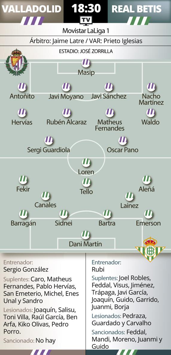 Sergio González, técnico vallisoletano, recupera a Míchel y Alcaraz para este último partido de Liga, pero no podrá contar con Pedro Porro, Salisu, Ben Arfa, Kike Pérez, Joaquín Fernández, Toni Villa, Raúl Carnero y Kiko Olivas, todos ellos lesionados. Por tanto, deberá hacer frente al Betis con tan solo dieciséis convocados, puesto que los jugadores del filial jugarán el play off de ascenso a Segunda con su equipo, han informado este sábado fuentes del club. La lista de convocados por el Valladolid está formada por Masip, Caro, Antoñito, Javi Sánchez, Moyano, Nacho, Fede San Emeterio, Hervías, Matheus, Míchel, Óscar Plano, Alcaraz, Waldo, Sandro, Enes Ünal y Sergi Guardiola.
