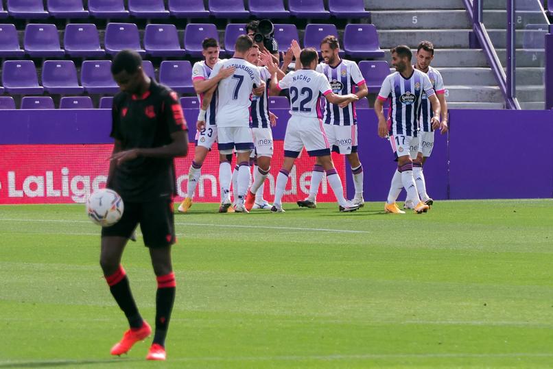 El equipo local, sin embargo, comenzó a girar el rumbo del partido pronto y empezó a meter el miedo en el cuerpo a la Real. Un centro a pie cambiado, a balón parado, casi lo rematan en el primer palo en el minuto 10 y, posteriormente, un centro afortunado de Nacho se fue cerrando al punto de casi sorprender a Remiro en el 13’. El juego de elaboración txuri urdin fue haciendo cada vez menos daño a un Valladolid ceñido a un diseño de partido que le interesaba. Robar, montar ataques rápidos y terminar las jugadas. Así fabricó una doble ocasión en el 18’, primero al ganarle la partida Guardiola dentro del área a Llorente, que se confío, evitando males mayores primero Remiro y luego el propio central madrileño, que sacó bajo palos la vaselina de Guardiola con el portero en el suelo. En la siguiente jugada Waldo remató al palo, por fuera, en otra transición rápida.