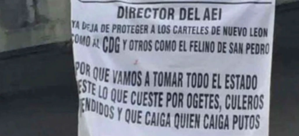 Al menos 11 mantas del crimen organizado firmadas por el Cartel Jalisco Nueva Generación (CJNG) con amenazas en contra del director de la Agencia Estatal de Investigaciones (AEI) han siso exhibidas durante este martes en diversos sitios de la zona metropolitana de Monterrey, principalmente en Monterrey, San Nicolás de los Garza y San Pedro.