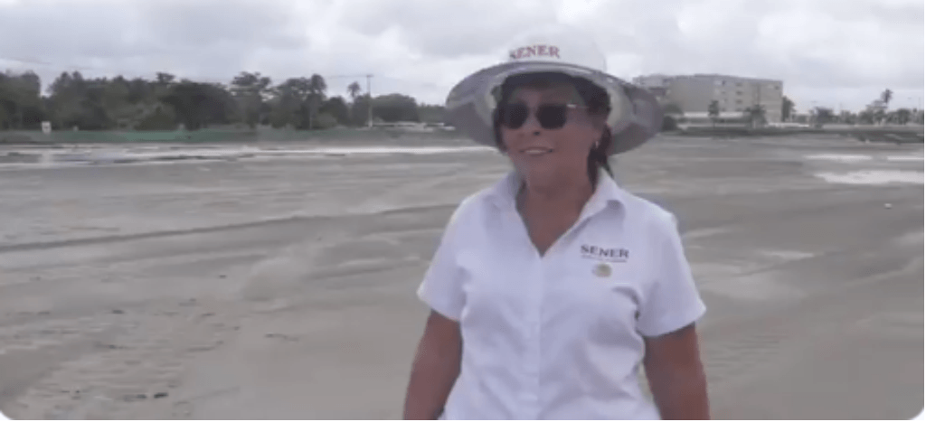 A través de sus redes sociales, la titular de la Secretaría de Energía (Sener) difundió un video donde se observa a la funcionara de pie sobre un terreno de arena compactada, la cual sería la parte final de la plataforma del primer predio.