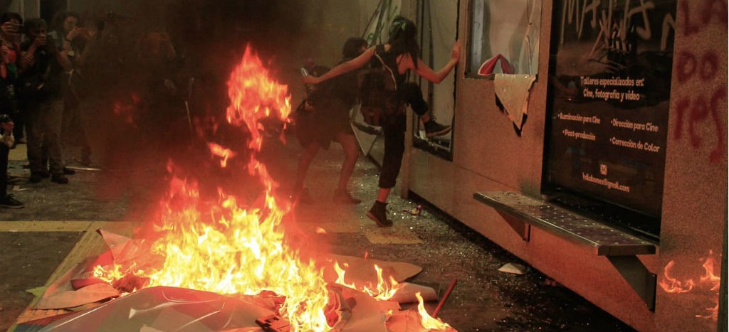 Manifestantes lesionan a mujeres policías, incendian sede policial y causan destrozos en estación del Metrobús.